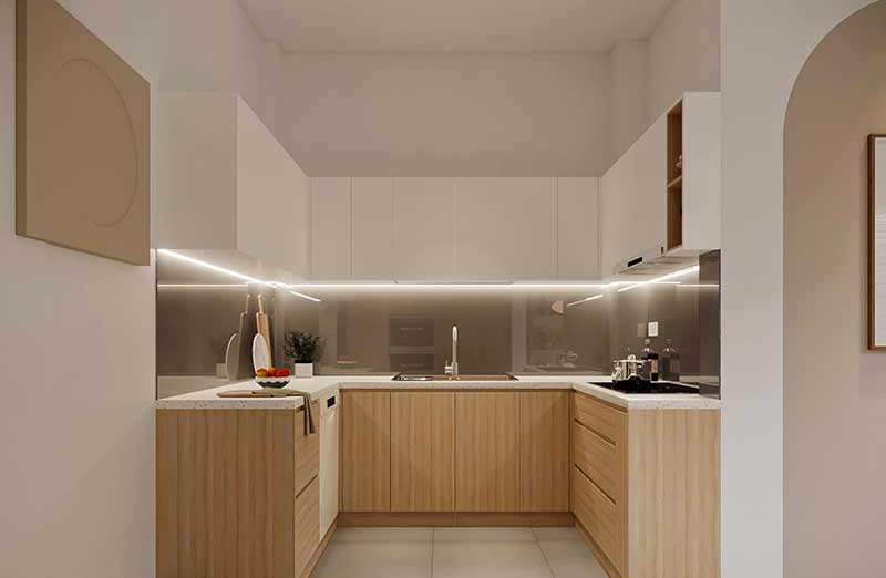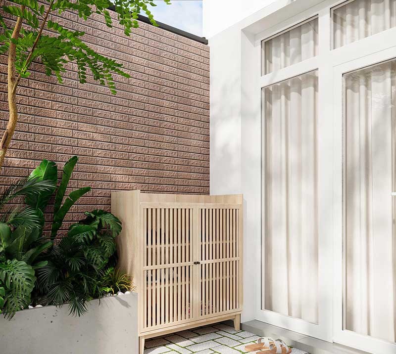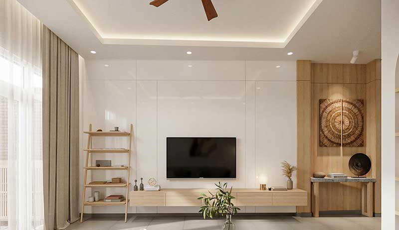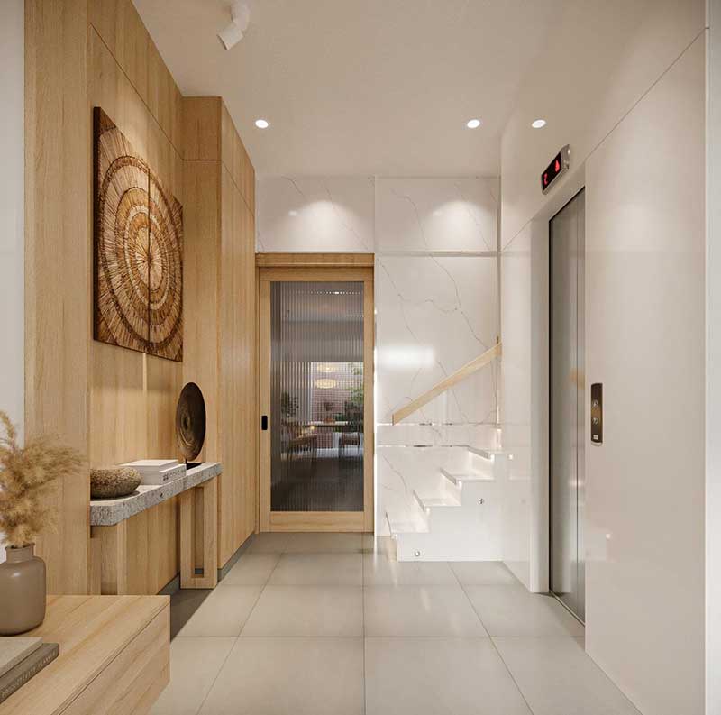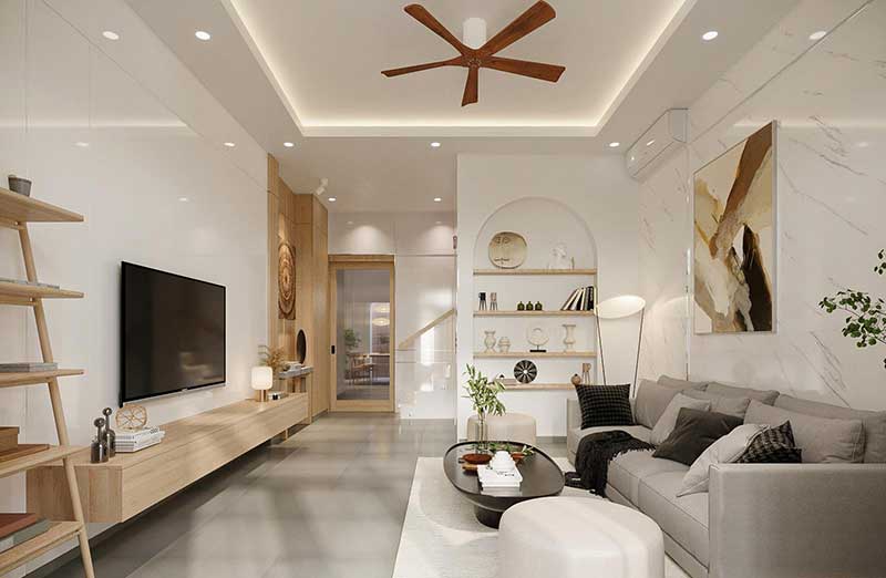 Mẫu thiết kế nội thất nhà phố độc đáo với cách phối hòa nguồn cảm hứng Japandi tao nhã trong không gian sống hiện đại. Gam màu trắng chủ đạo và chi tiết vân gỗ được kết hợp xuyên suốt thiết kế. Nội thất có thiết kế đơn giản, chú trọng công năng sử dụng và làm tăng tính thẩm mỹ chung cho ngôi nhà.
